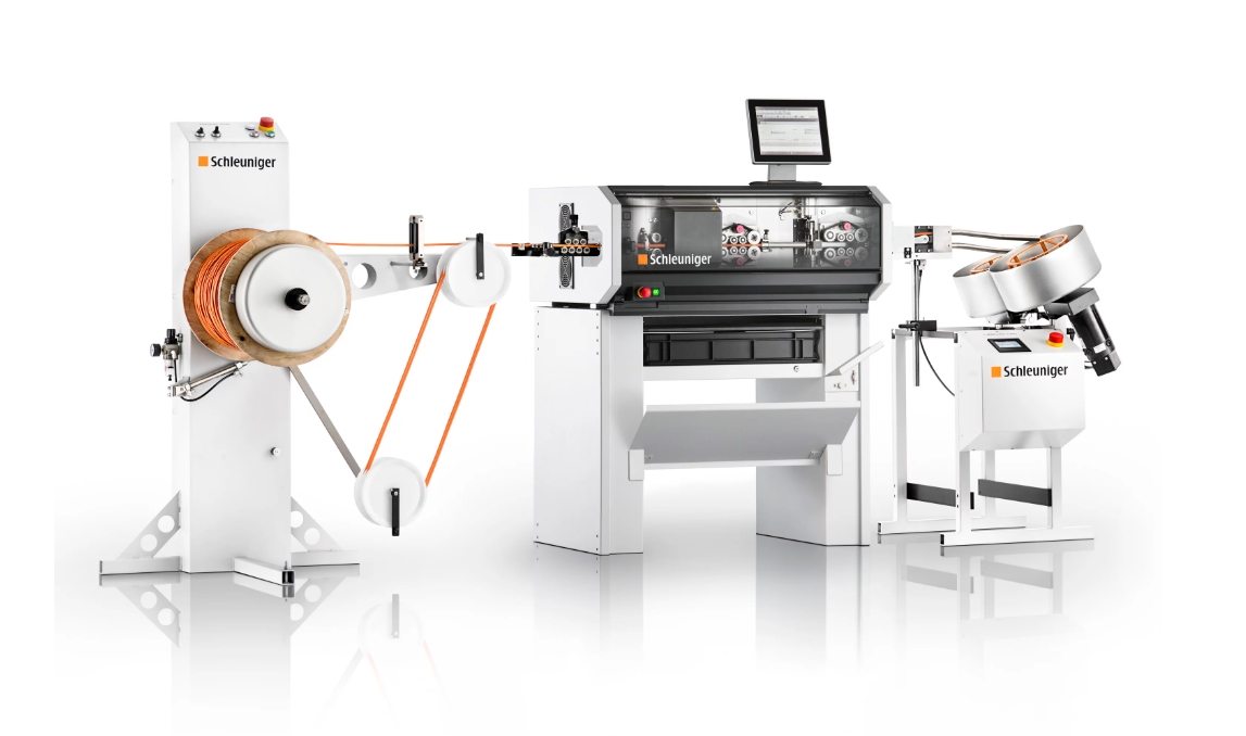 | Interfaces | Padrão: 3 x USB, 2 x Ethernet, bem como interfaces de pré-alimentação, hotstamp e pós-alimentação Opcional: 5 SMIs adicionais (Schleuniger Machine Interface) para até 2 sistemas de marcação, diferentes dispositivos periféricos e circuitos de parada de emergência |